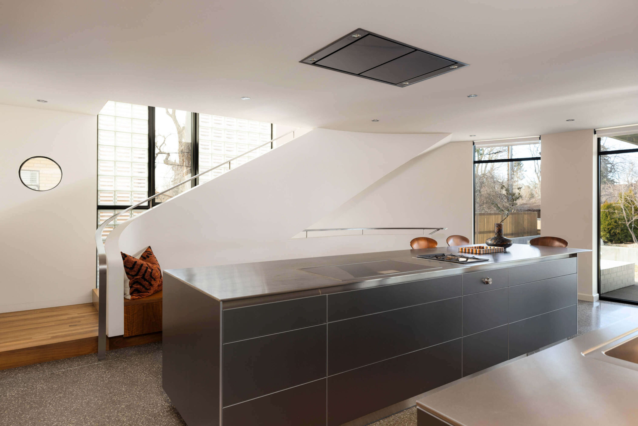 At the heart of the design, 1 cm stainless steel countertops establish a strong architectural gesture, echoing the stainless steel-clad patio ceiling beyond and visually extending the kitchen outward. This continuity reinforces the relationship between interior and exterior, while a fully integrated ceiling hood preserves open sightlines and allows the architecture to remain uninterrupted.