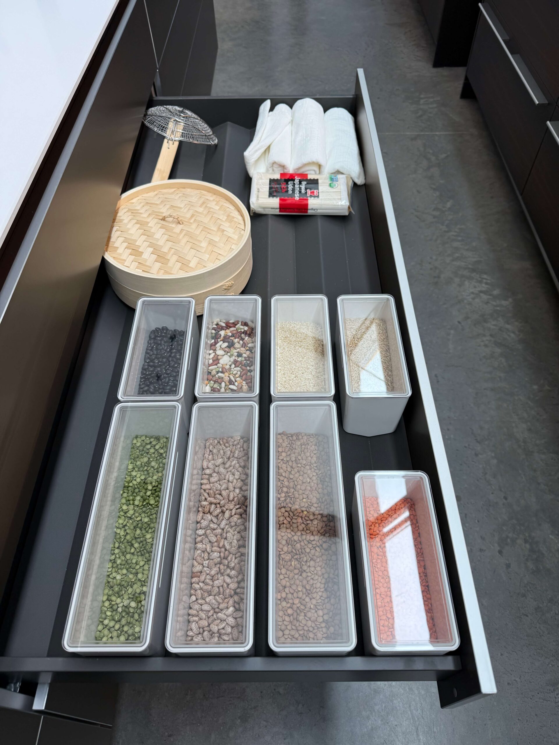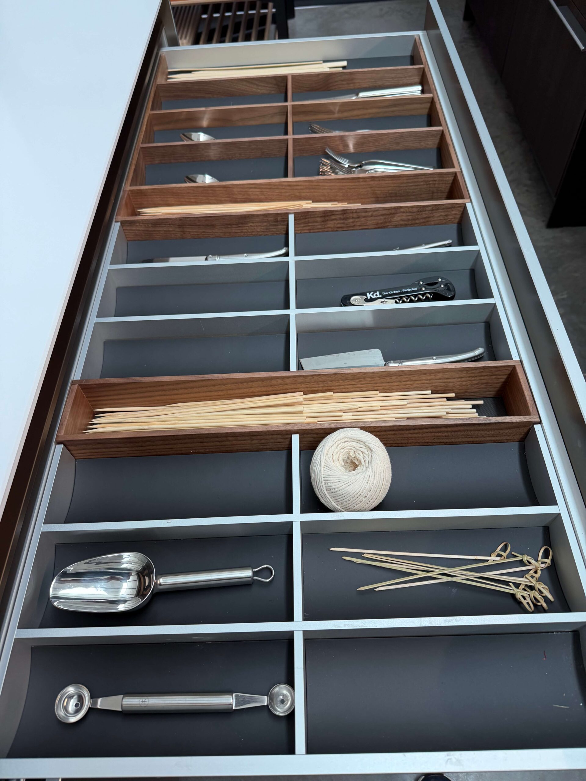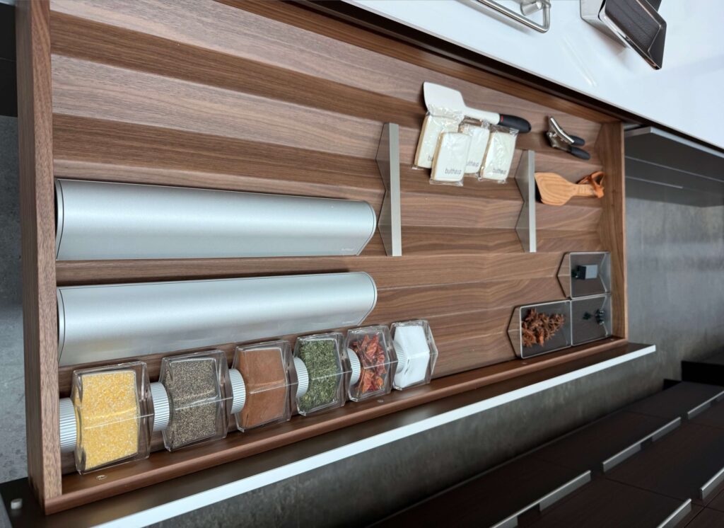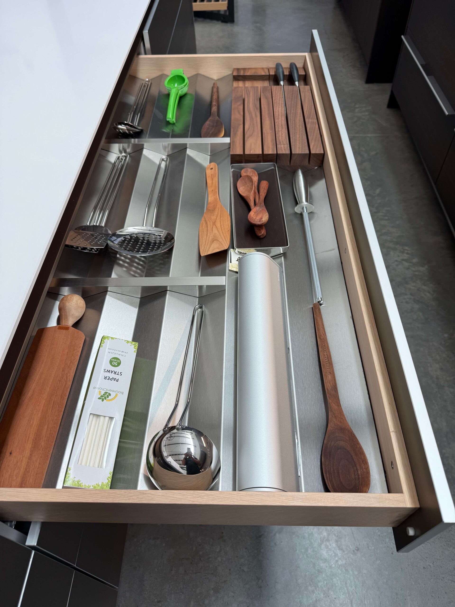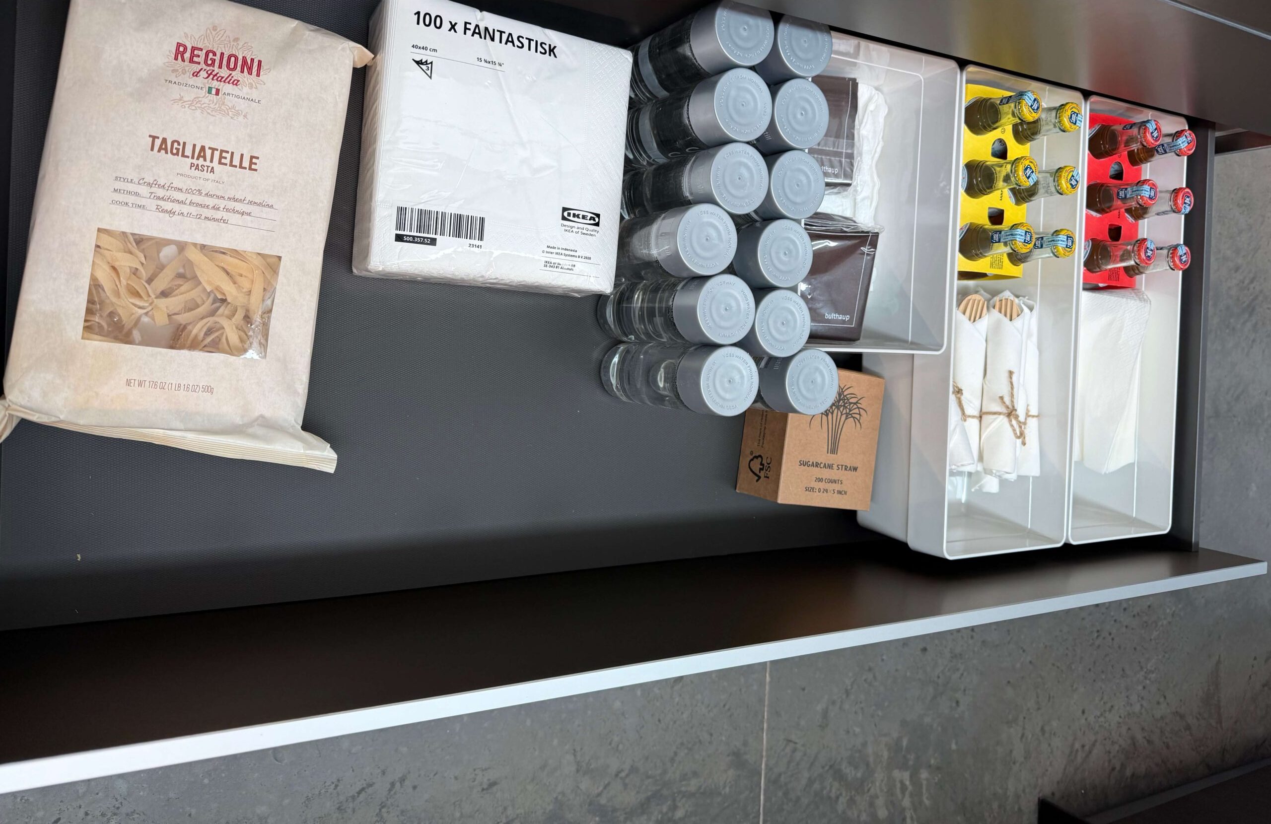 - Included select accessories: cutlery dividers, spice jars, knife holders, utensils tray, dish pegs, etc.