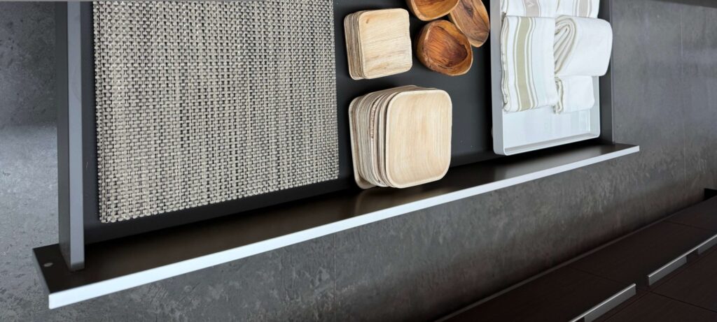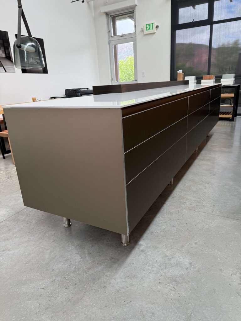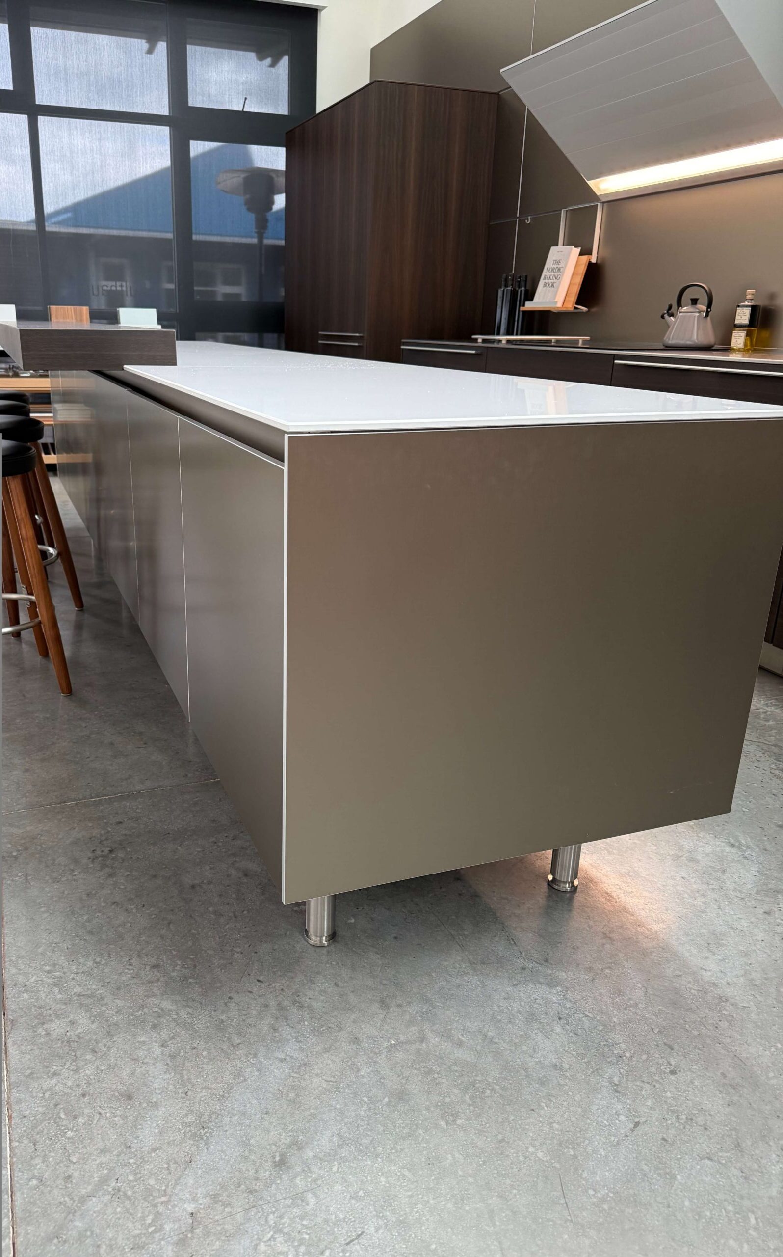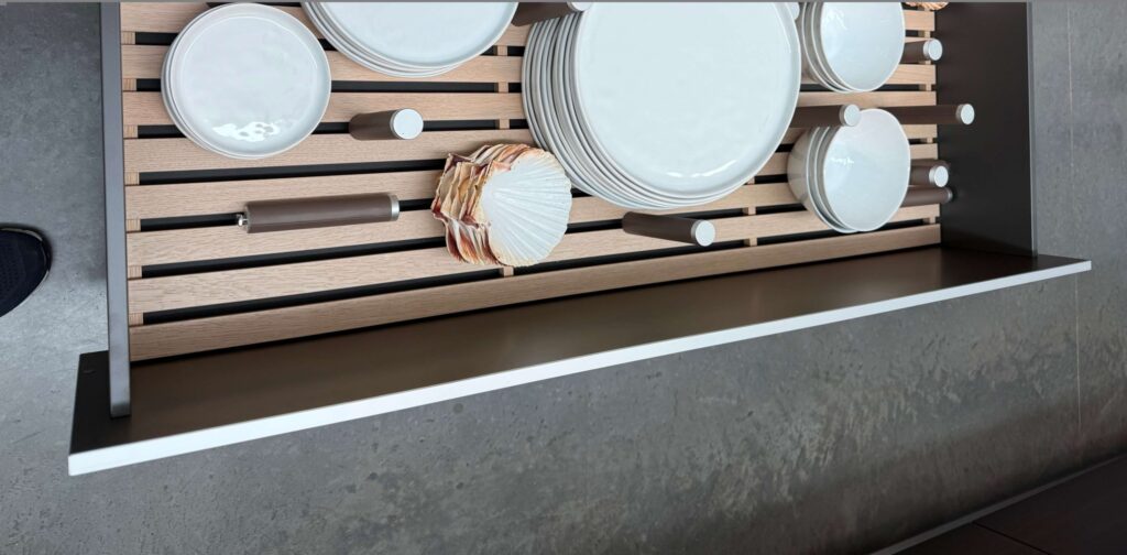 - Drawer fronts and panels finished in Sand Beige Aluminum