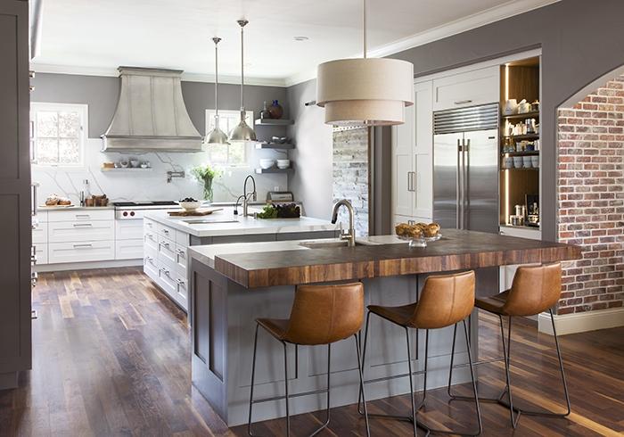 “I live in my kitchen. I wanted a space that relaxes me, provides great light, and allows me to explore my creativity and passion for food,” says this homeowner, who loves to entertain and has a background as a chef and bakery owner. Her formerly Tuscan-style kitchen in Denver’s Hilltop neighborhood was “dark and heavy,” and she wanted something bright and light. In the end, the walnut floors are the only feature she kept—the rest was transformed into a chef’s dream kitchen.