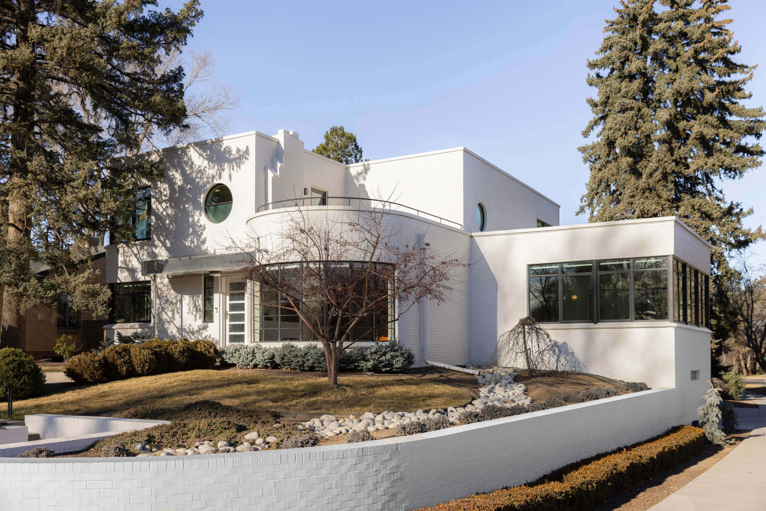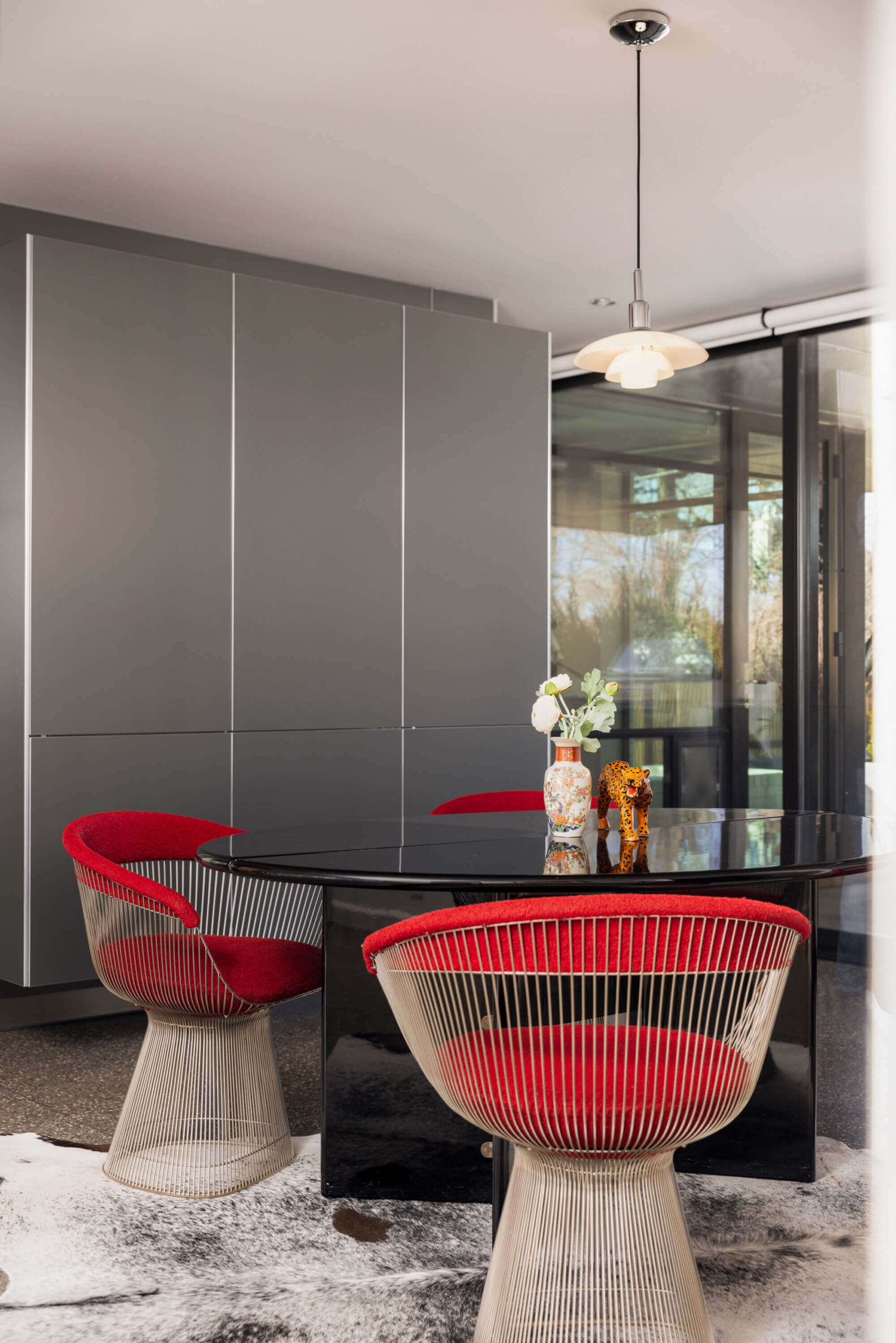 Thoughtfully integrated roll-up wall cabinets echo the home’s radius architecture, while adjacent wall-hanging pocket doors conceal a dedicated bar—effortlessly supporting the dining space and enhancing the home’s entertaining capabilities.