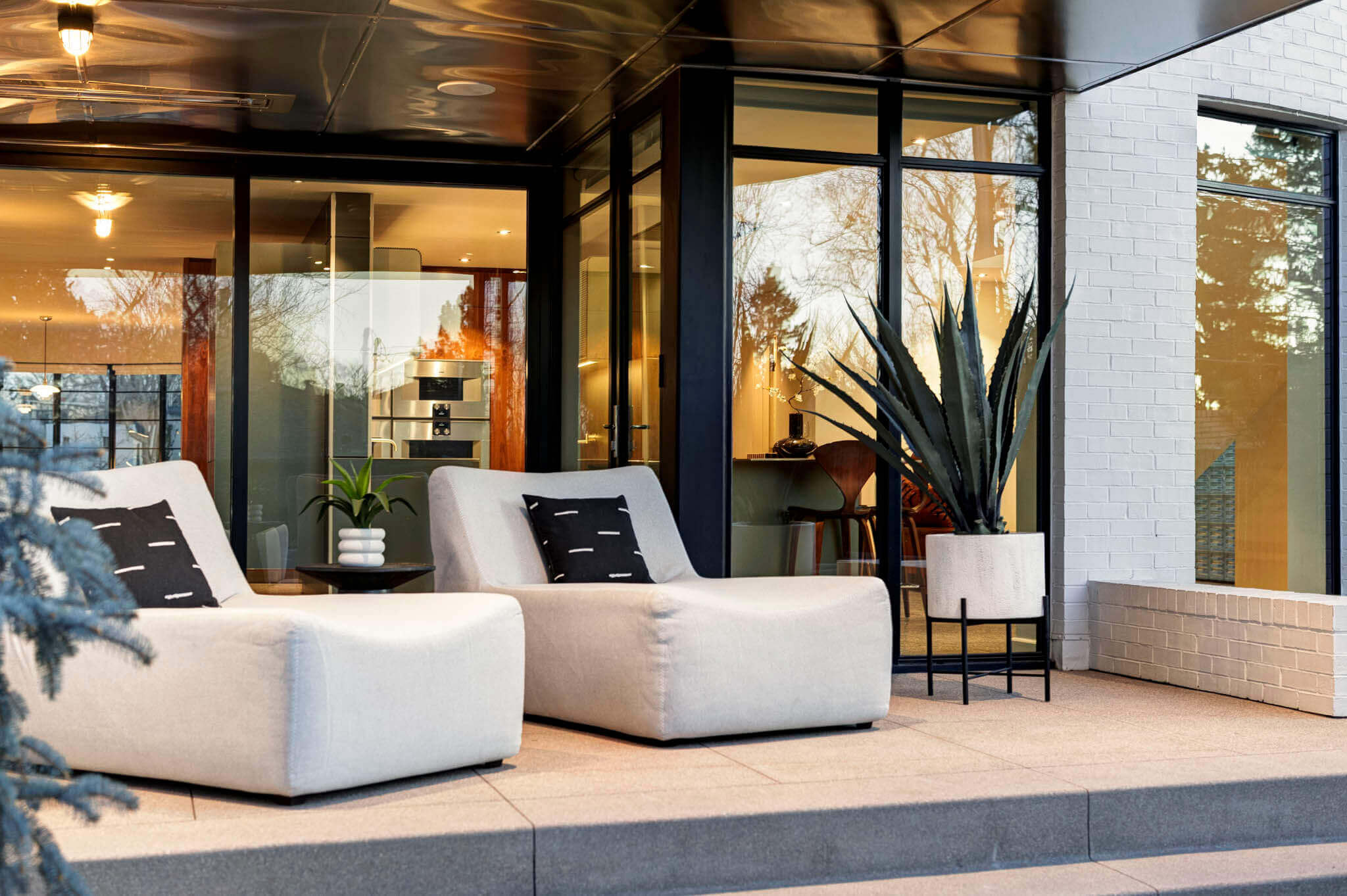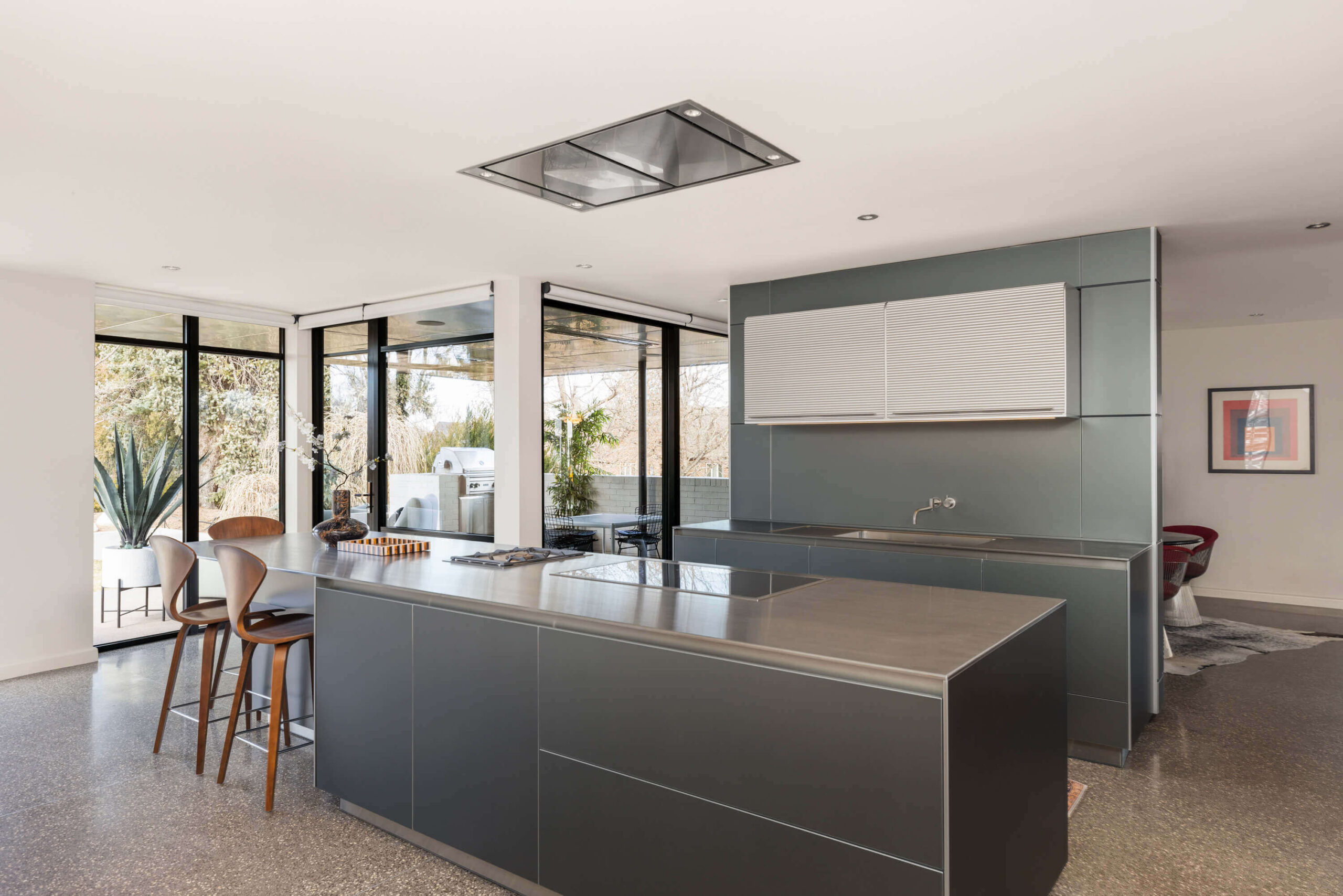 This Art Deco International–style residence celebrates terrazzo floors and a palette of honest, enduring materials—an ideal backdrop for a Bauhaus-inspired bulthaup kitchen. At the heart of the space, 1 cm stainless steel countertops create a seamless dialogue with the stainless steel patio ceiling beyond, visually extending the kitchen outward and reinforcing the connection between interior and exterior. A fully integrated ceiling hood preserves clean sightlines, allowing the architecture to remain uninterrupted.