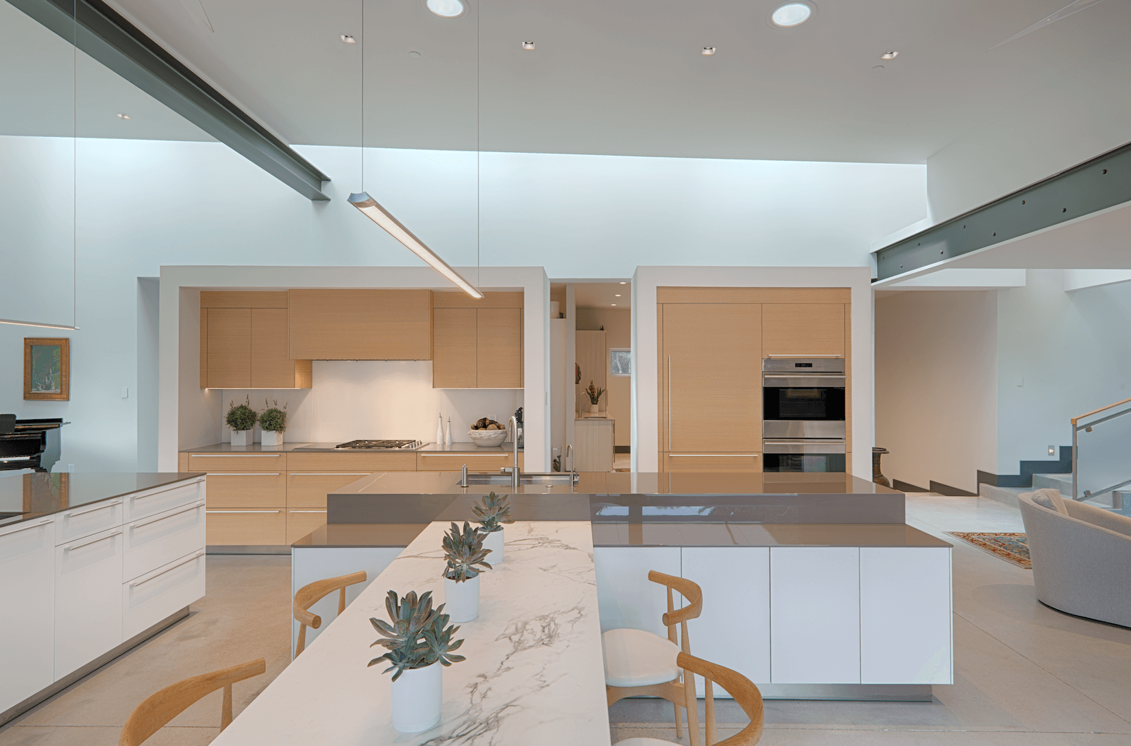In this new construction home, the vision was to create a welcoming space for our clients, who are empty nesters, and accommodate hosting for their grandchildren. A key feature is the sitting area attached to one of the islands, designed at counter height for easy accessibility for both adults and children. The materials chosen include vertical matched white oak veneer for the tall and cooktop elevation, paired with white lacquer for both islands, achieving a harmonious and inviting aesthetic.