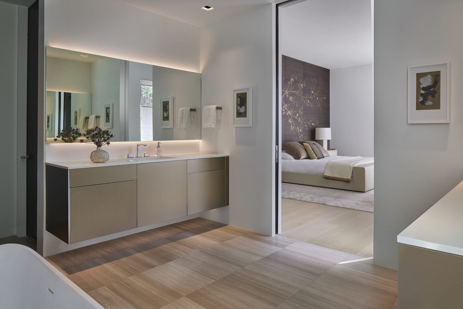 Step into a haven of contemporary design where wide-plank natural oak floors, pristine white walls, and abundant natural light converge to craft an open and inviting kitchen-living space. These harmonious elements set the perfect stage for the main attractions: sand beige anodized aluminum cabinetry, elegant white glass wall panels, and sleek white quartz composite countertops.